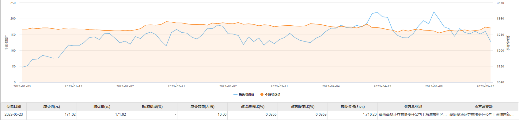 5月23日大宗交易成交10万股,成交额1710.2万元,占当日总成交额的4.72%,成交价171.02元,较市场收盘价171.02元持平。