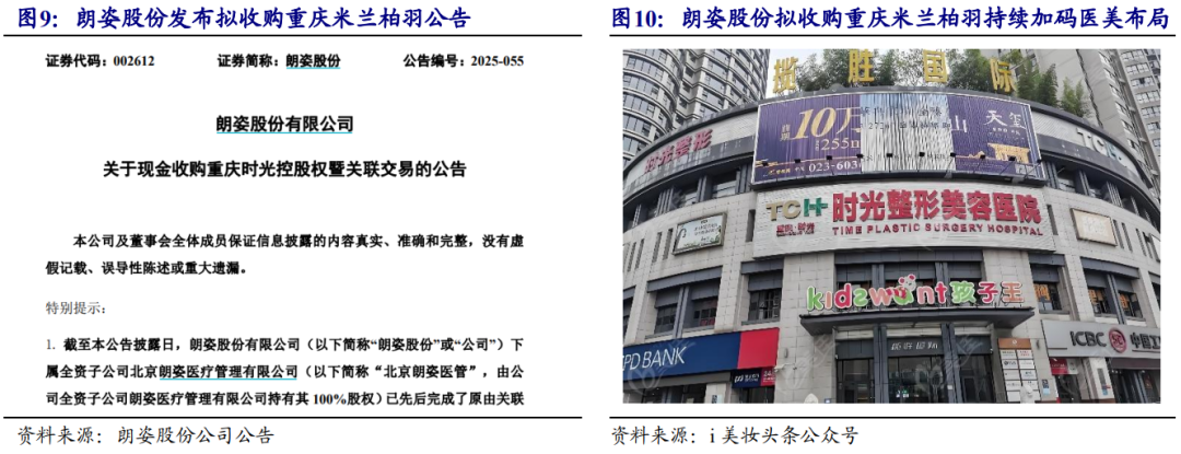 朗姿股份拟收购重庆米兰柏羽。2025年9月10日朗姿股份发布公告,子公司北京朗姿医管拟以现金方式收购博恒二号所持有的重庆米兰柏羽67.5%股权,转让价9247.5万元,交易完成后重庆米兰柏羽将纳入合并报表。博恒二号作出业绩承诺,保证重庆米兰柏羽2025至2027年净利润分别不低于929万元、989万元和1183万元,三年累计不低于3101万元。此次并购采用“体外培育+成熟后收购”模式,公司通过参与设立医美产业基金先行孵化标的,再在标的实现管理规范化与持续盈利后完成收购,降低利润波动风险。朗姿股份先后参与设立了包括博恒二号在内的七支医美并购基金,基金整体规模可达28.37亿元。我们认为,本次收购将带来业绩承诺下的利润增长,未来公司有望持续扩大医美版图和业务布局。