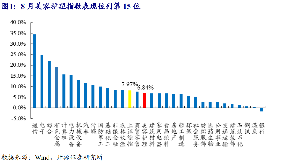 8月美容护理指数上涨6.84%,位列第15位。美容护理指数8月报收5052.44点,涨幅为6.84%,在所有一级行业中位列第15位,表现弱于大盘(8月上证综指上升7.97%)。