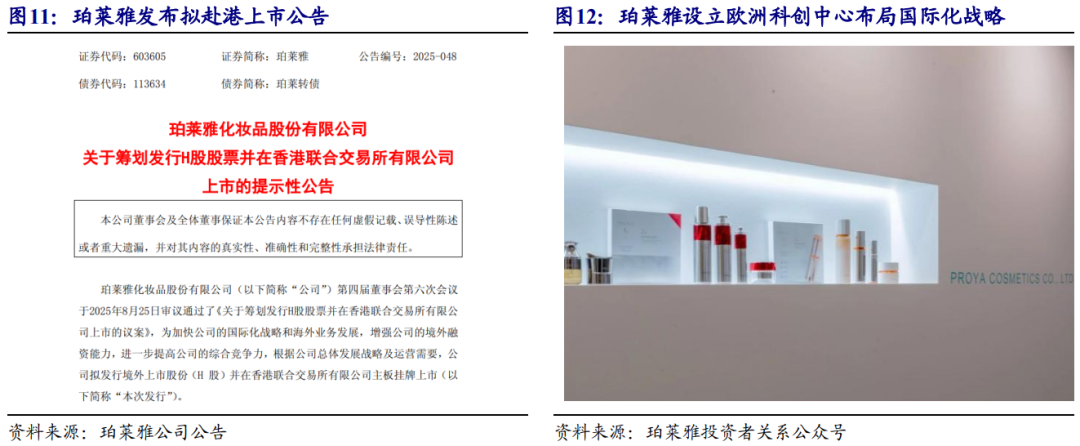 珀莱雅拟赴港上市,加快国际化战略推进。2025年8月26日珀莱雅发布公告,拟发行境外上市股份(H股)并在香港联合交易所有限公司主板挂牌上市。若登陆港交所成功,珀莱雅或将成为首个A+H股上市的美妆企业。发行不涉及控股权变动,发行后公司有望加快国际化战略与海外业务发展、增强境外融资能力。我们认为,赴港上市将拓宽公司融资渠道,加快公司海外业务发展,为多品牌与海外业务扩张提供资金与平台支撑,推动品牌中长期成长及国际化。