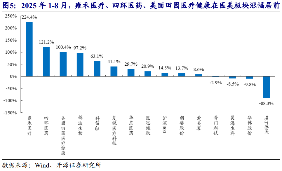 2025年1-8月,雍禾医疗、四环医药、美丽田园医疗健康在医美板块涨幅居前。2025年1-8月,医美板块所选公司中共计10家上涨、4家下跌。其中,雍禾医疗、四环医药、美丽田园医疗健康在医美板块中涨幅居前,累计涨幅分别为224.4%、121.2%、100.4%;2025年1-8月跌幅靠前的分别为昊海生科、华韩股份、*ST苏吴。