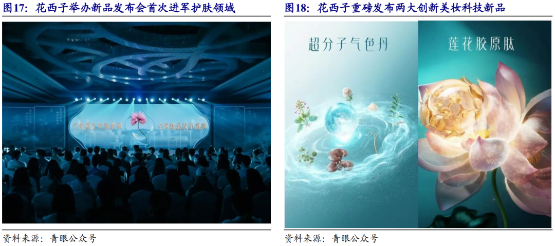 花西子布局护肤领域。2025年9月8日花西子在杭州举办气色双生护肤系列全球新品发布会,首次进军护肤领域。公司推出全新“气色双生”护肤产品线,涵盖早/晚次抛精华、早/晚面霜、水乳、面膜6大核心SKU,并重磅发布 “莲花胶原肽”、“超分子气色丹” 两大创新美妆科技新品。首创 “遵循东方节律,早晚协同护理”方案,从抗垮修护与焕亮养色两大维度,赋予皮肤好气色。我们认为,花西子此次切入护肤领域完成了从“东方彩妆”到“综合美妆”的战略升级,护肤品类有望增强与彩妆的协同效应,同时凭借东方文化叙事与差异化科技路径,公司有望在护肤市场中实现差异化竞争,打开新的成长空间。