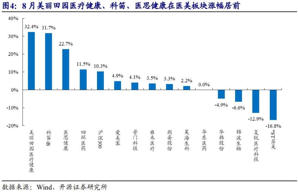 8月,美丽田园医疗健康、科笛、医思健康在医美板块涨幅居前。我们选取的14家医美上市公司(含新三板挂牌公司)中8月共计9家上涨、1家持平、4家下跌。其中,月涨幅靠前的为美丽田园医疗健康、科笛、医思健康,月涨幅分别为32.4%、31.7%、22.7%;月表现靠后的为锦波生物、复锐医疗科技、*ST苏吴(维权)。