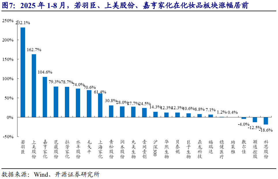 2025年1-8月,若羽臣、上美股份、嘉亨家化在化妆品板块中涨幅居前。2025年1-8月,化妆品板块所选公司中共19家上涨、3家下跌。其中,若羽臣、上美股份、嘉亨家化在化妆品板块中涨幅居前,累计涨幅分别为232.1%、162.7%、104.6%;2025年1-8月跌幅靠前的分别为敷尔佳、颖通控股、科思股份。