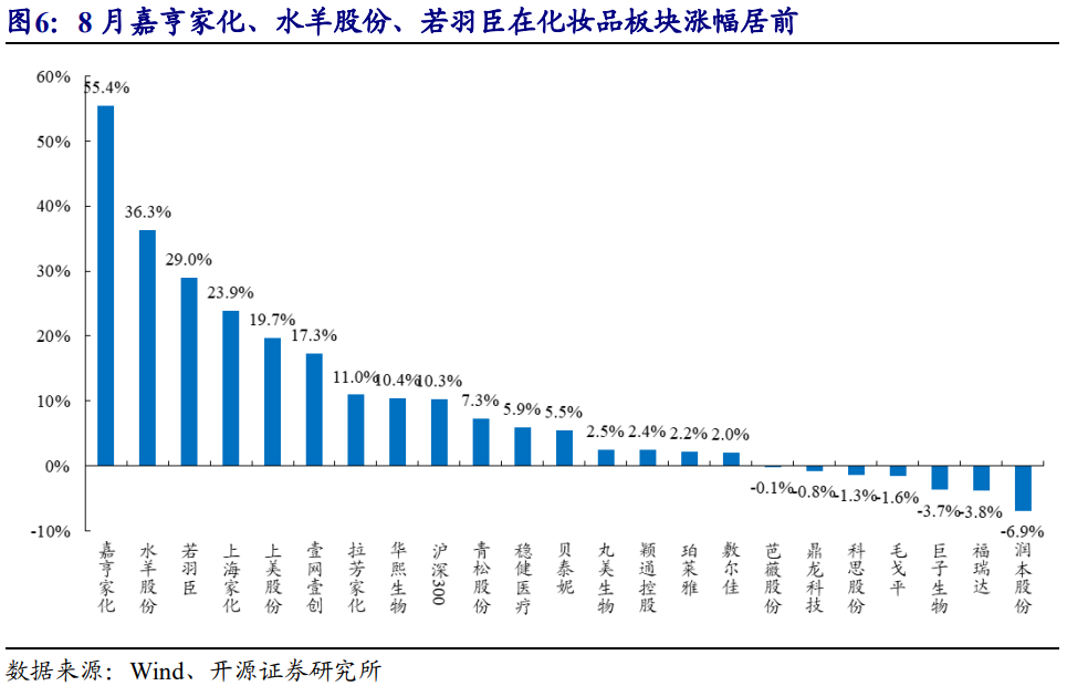8月,嘉亨家化、水羊股份、若羽臣在化妆品板块涨幅靠前。在我们选取的22家化妆品上市公司中,8月共计15家上涨、7家下跌。其中,8月涨幅靠前的为嘉亨家化、水羊股份、若羽臣,月涨幅分别为55.4%、36.3%、29.0%;月跌幅靠前的分别为巨子生物、福瑞达、润本股份。