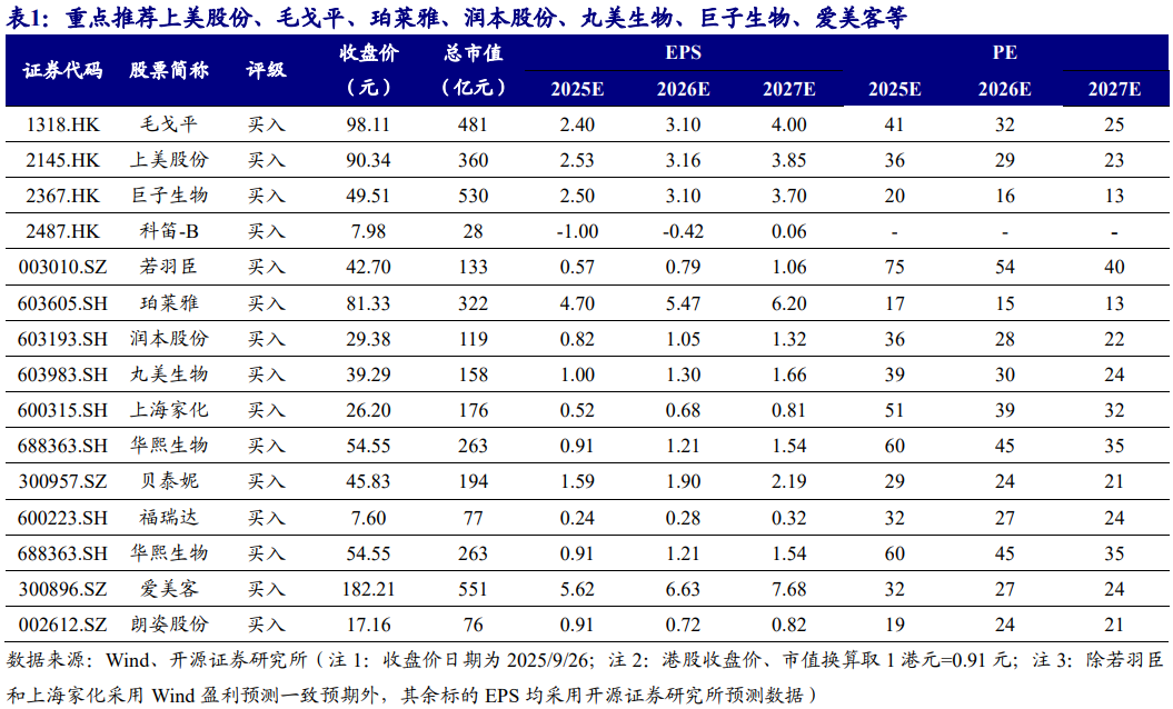 (1)珀莱雅拟赴港上市:2025年8月26日珀莱雅发布公告,拟发行境外上市股份(H股)并在香港主板挂牌上市。若登陆成功,珀莱雅或将成为首个A+H股上市的美妆企业,将拓宽公司融资渠道,加快公司海外业务发展。(2)珀莱雅投资花知晓:2025年9月1日花知晓宣布完成珀莱雅独家投资的B轮融资,将强化珀莱雅在彩妆与年轻客群的布局,借助花知晓内容运营与出海渠道加速国际化推进。(3)上美股份彩妆品牌NAN beauty上市:2025年8月14日上美股份化妆师彩妆品牌NAN beauty举办品牌发布会,首批产品于9月9日在抖音平台正式上线,品牌推出为上美推进“多品牌、全品类”战略中的重要进展。(4)花西子布局护肤领域:2025年9月8日花西子举办护肤系列新品发布会,首次进军护肤领域,推出全新“气色双生”护肤产品线,赋予皮肤好气色。公司布局护肤完成了从“东方彩妆”到“综合美妆”的战略升级,有望增强与彩妆的协同效应。
