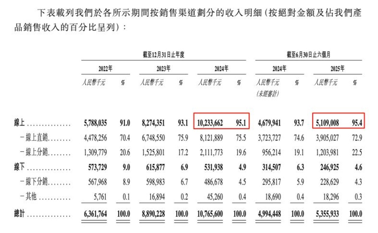 数据显示,2022年以来珀莱雅线上渠道收入占比一直维持在90%以上,到2024年占比提升到95.1%,其中线上直销占比达到75.5%,线上分销为19.6%。截至今年上半年,线上渠道收入占比进一步提升到95.4%。