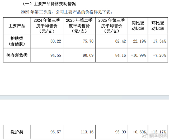 如果只看财报,反而可能陷入一个误区,将其单季回撤归因于宏观、周期、偶然。相反,其关于2025年第三季度主要经营数据的公告,已将增长瓶颈出现在哪些环节,呈现得较为清晰。公告显示,珀莱雅护肤类产品平均售价从2024年第三季度的80.22元/支,降至2025年第三季度的62.42元/支,同比变动比率为-22.19%,环比变动比率为-17.54%。彩妆类平均售价同比-10.99%,环比-7.20%。