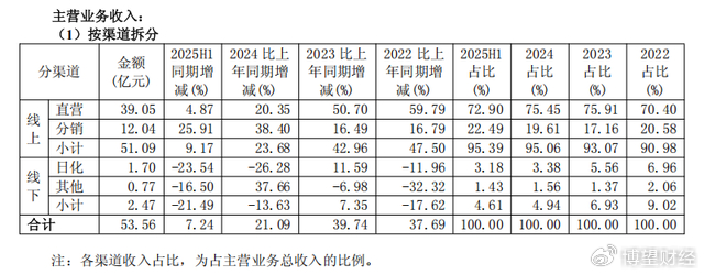 要理解珀莱雅何以增长乏力,渠道是一条更贴近经营现实的线索。其2025年半年度报告显示,珀莱雅线上直销收入为39.05亿元,同比增长4.87%;线上经销收入为12.04亿元,同比增长25.91%;线下收入为2.47亿元,同比下降21.49%。这组数据中值得关注的变化,不是线上增长,而是线下的缩减幅度,且线上增长更明显来自经销的放大。