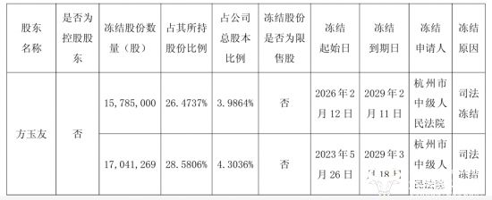 公告显示,据法院下达的《财产保全事项通知书》,因执行保全需要,新增冻结方玉友持有的公司股份1578.50万股,同时继续冻结其此前已处于冻结状态的约1704.13万股股份。两笔合计,方玉友名下累计被冻结股份约3282.63万股,占其持股总量的55.05%,占公司总股本的8.29%。