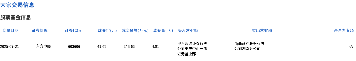 东方电缆今日大宗交易折价成交4.91万股,成交额243.63万元