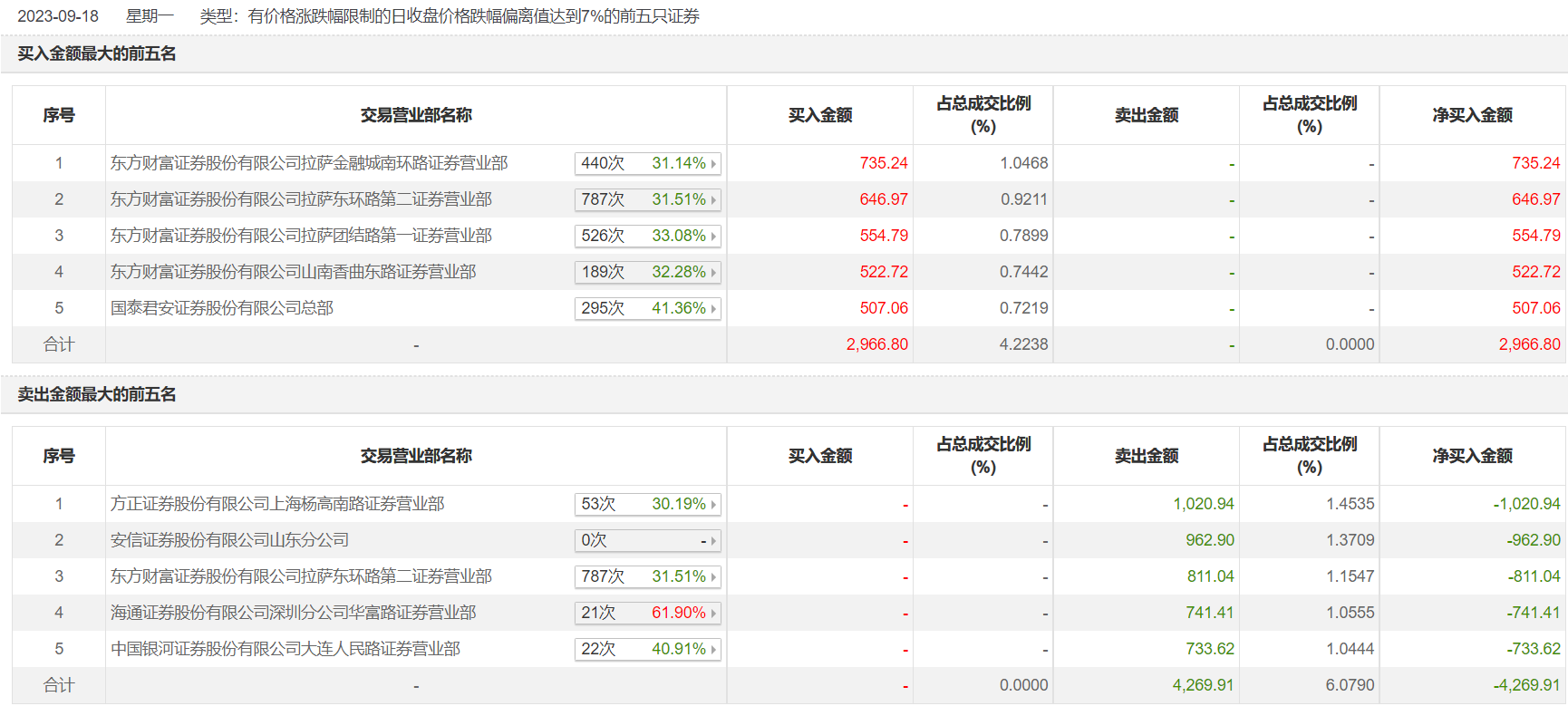 具体来看,方正证券上海杨高南路证券营业部、安信证券山东分公司分别卖出1020.94万元、962.90万元;东方财富证券拉萨金融城南环路证券营业部、东方财富证券拉萨东环路第二证券营业部分别买入735.24万元、646.97万元。