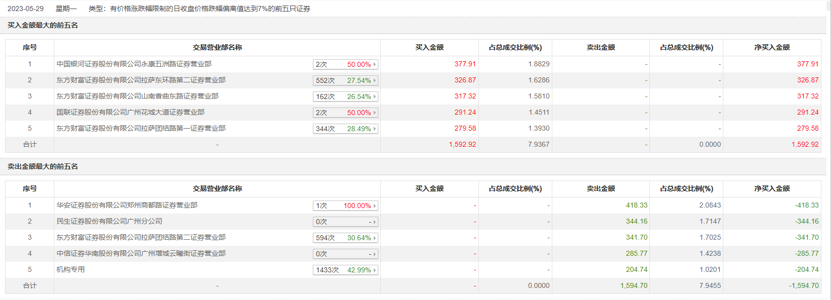 5月29日,天创时尚今日跌停,龙虎榜数据显示,上榜营业部席位全天成交3187.62万元,占当日总成交金额比例为15.88%。其中,买入金额为1592.92万元,卖出金额为1594.7万元,合计净卖出1.77万元。