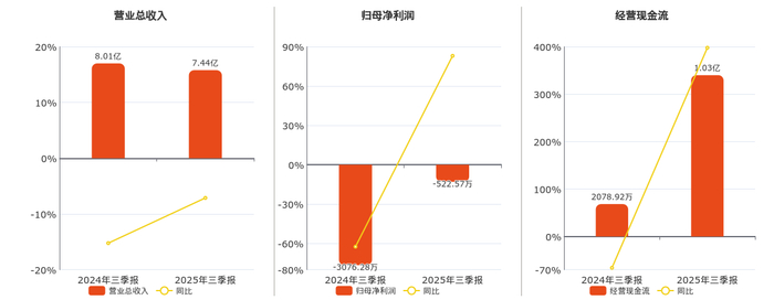 公司营业总收入为7.44亿元,在已披露的同业公司中排名第37,较去年同报告期营业总收入减少5700.91万元,同比较去年同期下降7.12%。归母净利润为-522.57万元,在已披露的同业公司中排名第43。经营活动现金净流入为1.03亿元。