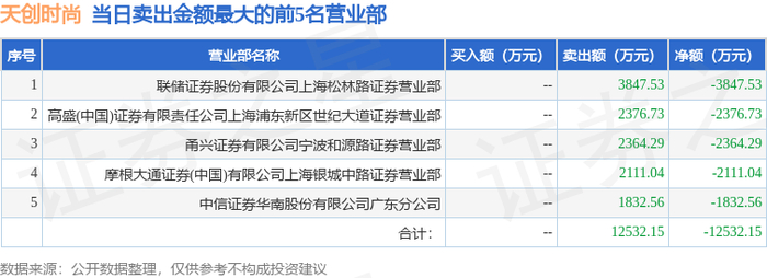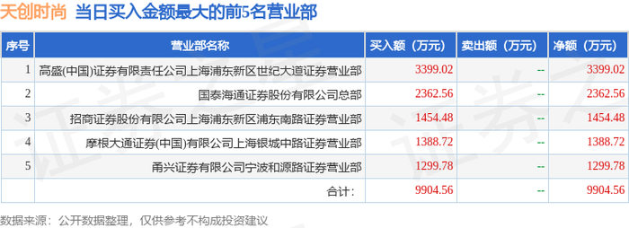 1月5日天创时尚(603608)龙虎榜数据:游资上海松林路上榜