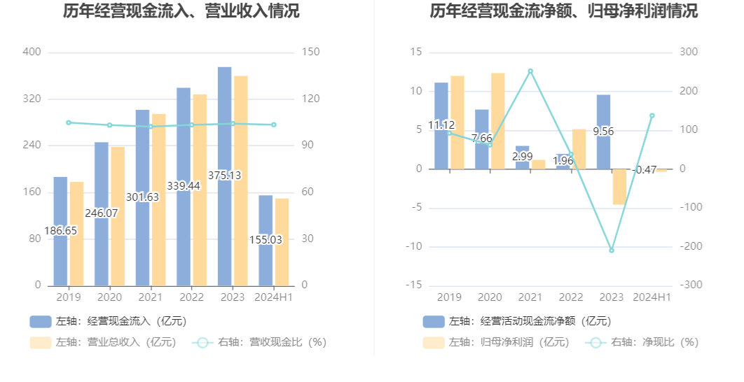 2024年上半年,公司经营活动现金流净额为-4689.24万元,同比减少2.97亿元;筹资活动现金流净额-1.32亿元,同比减少4319.06万元;投资活动现金流净额-2.50亿元,上年同期为-1.78亿元。