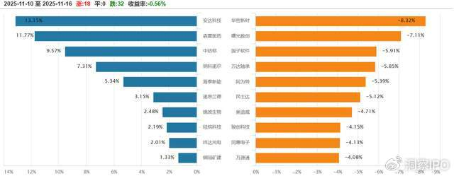 上周(11月10日-11月16日),北证50指数周跌0.56%至1514.20点。北证50成分股中,18只上涨,0只平盘,32只下跌。