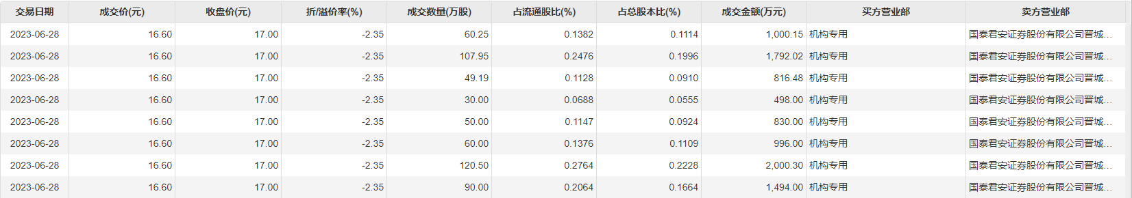 6月28日大宗交易成交567.89万股,成交额9426.95万元,占当日总成交额的59.44%,成交价16.6元,较市场收盘价17元折价2.35%。