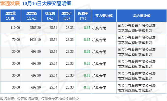 10月16日索通发展现6笔大宗交易 机构净买入6999万元