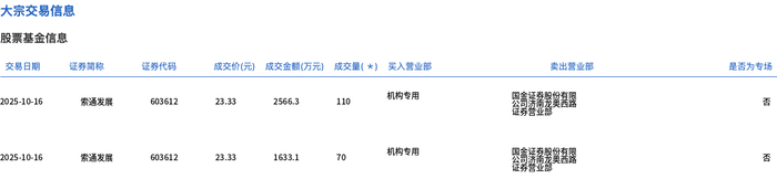 10月16日,索通发展大宗交易成交300万股,成交额6999万元,占当日总成交额的9.55%,成交价23.33元,较市场收盘价25.54元折价8.65%。