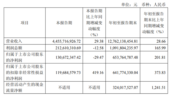 报告显示,索通发展公司前三季度营业收入为127.62亿元,同比增长28.66%;归母净利润为6.54亿元,同比增长201.81%;扣非归母净利润为6.42亿元,同比增长373.83%;基本每股收益1.31元。