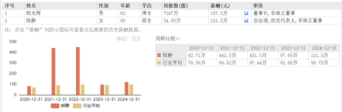 据东方财富网数据,索通发展总经理、董事郎静2022-2024年分别领薪451万、97.6万元和121.3万元,近三年降薪73.10%。