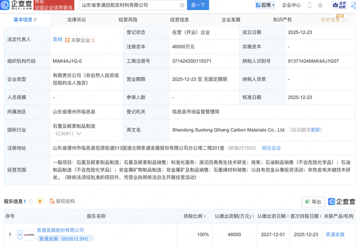 企查查APP显示,近日,山东省索通启航炭材料有限公司成立,注册资本4.6亿元,经营范围包含:非金属矿及制品销售;石墨烯材料销售;以自有资金从事投资活动;余热发电关键技术研发等。企查查股权穿透显示,该公司由索通发展(603612)全资持股。