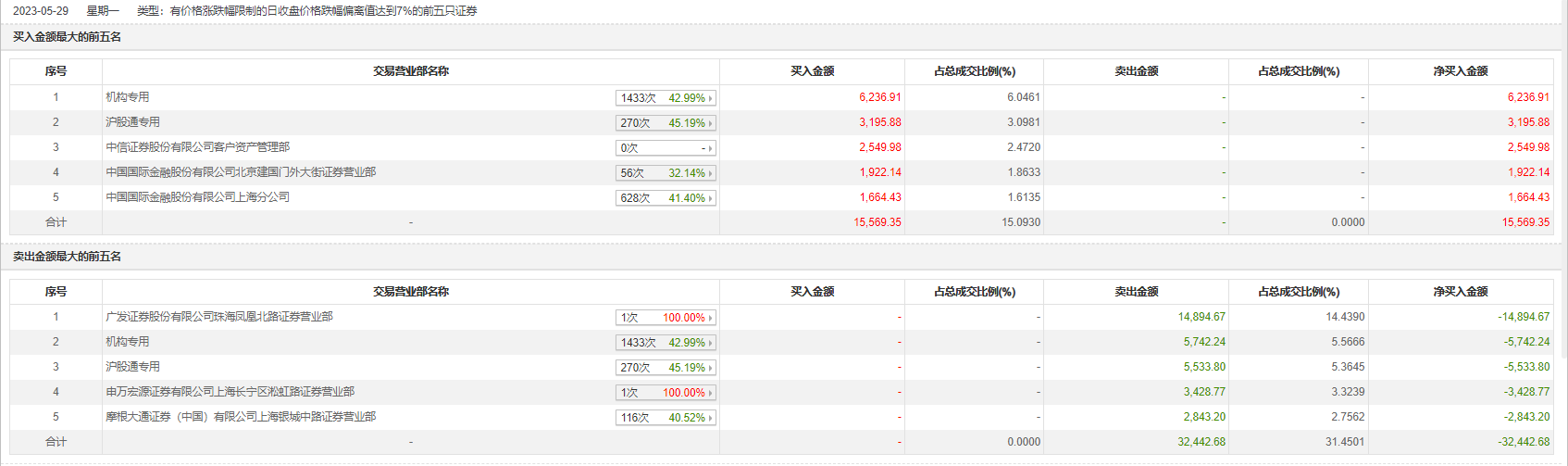 5月29日,国联股份今日跌停,龙虎榜数据显示,上榜营业部席位全天成交4.8亿元,占当日总成交金额比例为46.54%。其中,买入金额为1.56亿元,卖出金额为3.24亿元,合计净卖出1.69亿元。
