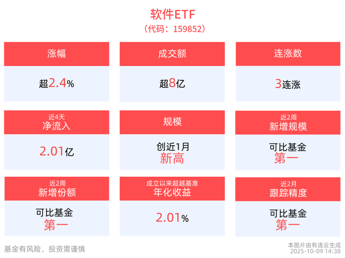 截至9月30日,软件ETF近3年净值上涨34.37%。从收益能力看,截至2025年9月30日,软件ETF自成立以来,最高单月回报为39.35%,最长连涨月数为3个月,最长连涨涨幅为69.40%,上涨月份平均收益率为10.06%。