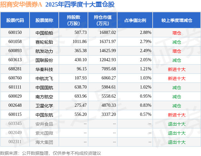 招商安华债券A的前十大重仓股如下: