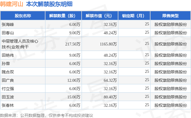 韩建河山(603616)292.5万股限售股将于9月26日解禁,占总股本0.75%