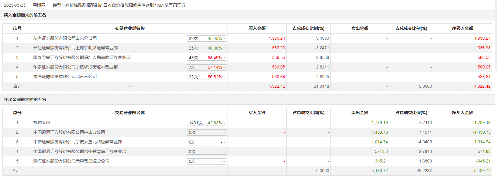 5月25日,杭电股份今日涨停,龙虎榜数据显示,上榜营业部席位全天成交9503.14万元,占当日总成交金额比例为46.27%。其中,买入金额为4322.42万元,卖出金额为5180.72万元,合计净卖出858.3万元。