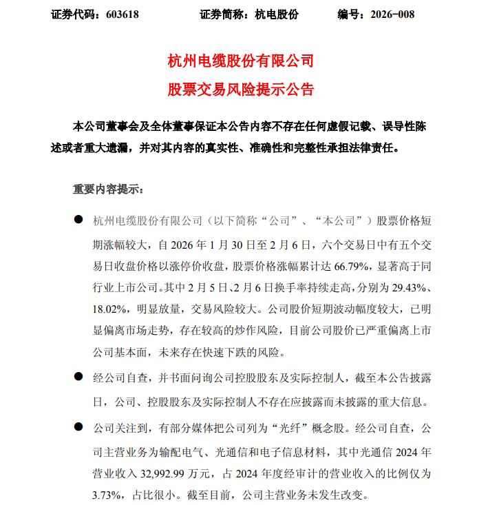 2月6日,杭电股份(603618.SH)公告称,公司股票价格短期涨幅较大,自2026年1月30日至2月6日,六个交易日中有五个交易日收盘价格以涨停价收盘,股票价格涨幅累计达66.79%,显著高于同行业上市公司。