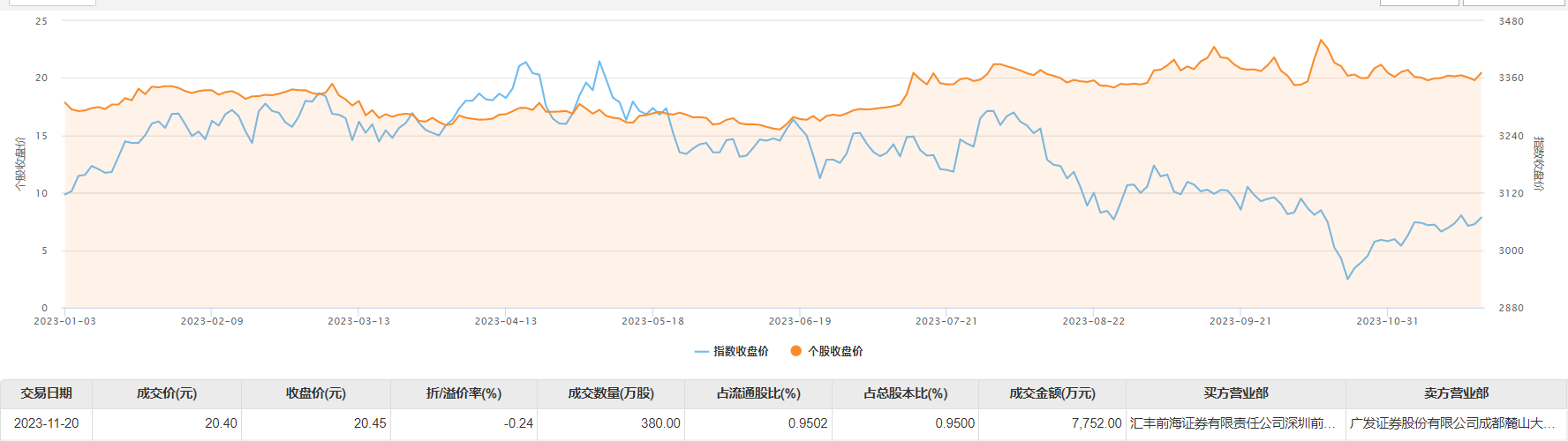 11月20日大宗交易成交380万股,成交额7752万元,占当日总成交额的34.96%,成交价20.4元,较市场收盘价折价0.24%。