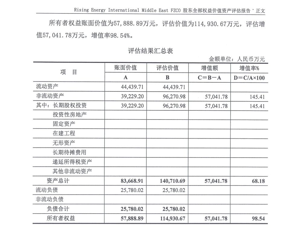 从资产构成来看,增值全部来源于非流动资产中的长期股权投资部分,该项资产的账面价值约为3.92亿元,评估价值跃升至9.63亿元,增值额为5.70亿元,增值率更是达到了145.41%。其长期股权投资,主要指昕华夏迪拜持有的坚戈油田项目公司股权。