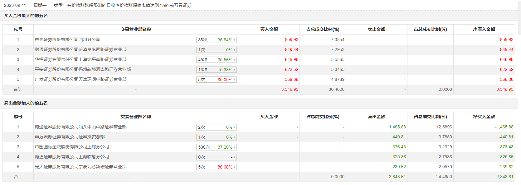 具体来看,东莞证券四川分公司、财通证券乐清良港西路证券营业部分别买入859.93万元、849.44万元;海通证券汕头中山中路证券营业部、申万宏源证券有限公司证券投资总部分别卖出1465.88万元、440.81万元。