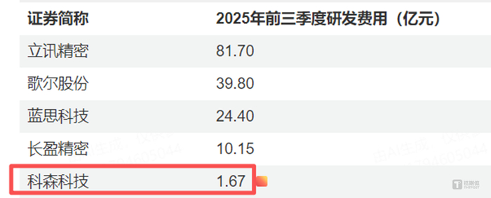 研发投入方面,公司持续保持同比高位,但环比业内并不出众。财报显示,科森科技2025年前三季度研发费用1.67亿元,占营收比重6.81%,同比增幅15.2%,主要用于折叠屏手机铰链、散热模组等高附加值产品工艺突破。