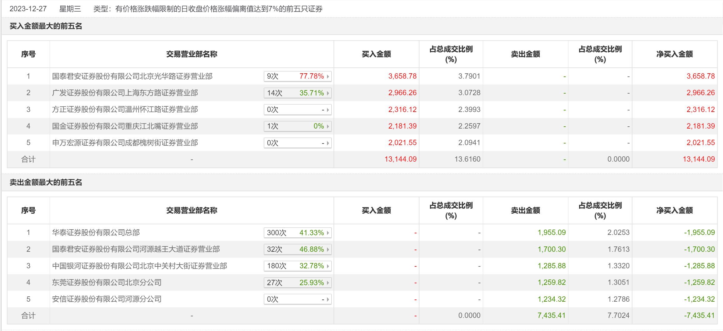具体来看,知名游资现身龙虎榜,著名刺客(东莞证券股份有限公司北京分公司)净卖出1259.82万元。此外,国泰君安证券北京光华路证券营业部、广发证券上海东方路证券营业部分别买入3658.78万元、2966.26万元;华泰证券总部、国泰君安证券河源越王大道证券营业部分别卖出1955.09万元、1700.30万元。