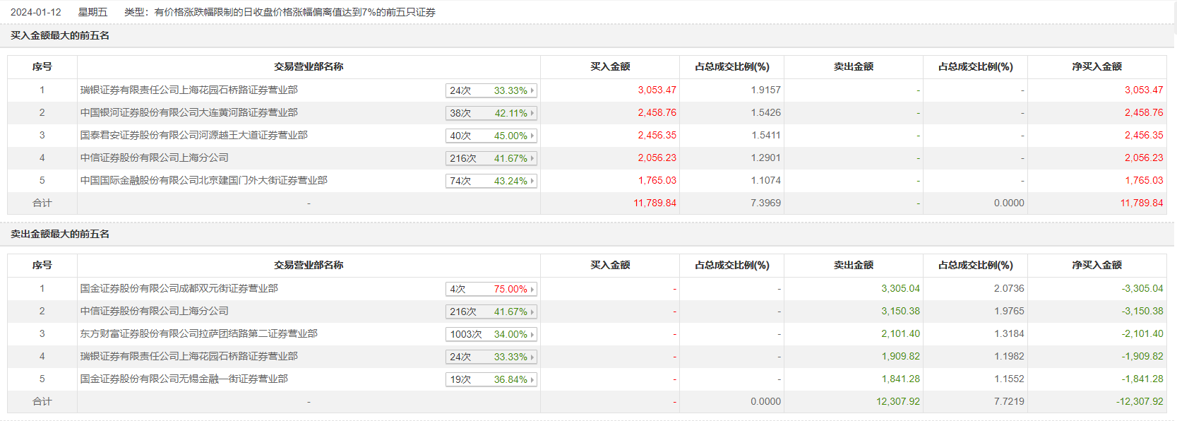 1月12日,清源股份今日涨停,全天换手率达23.87%,振幅达11.89%。龙虎榜数据显示,营业部席位合计净卖出518.08万元。其中,瑞银证券上海花园石桥路证券营业部、中国银河证券大连黄河路证券营业部分别买入3053.47万元、2458.76万元;国金证券成都双元街证券营业部、中信证券上海分公司分别卖出3305.04万元、3150.38万元。