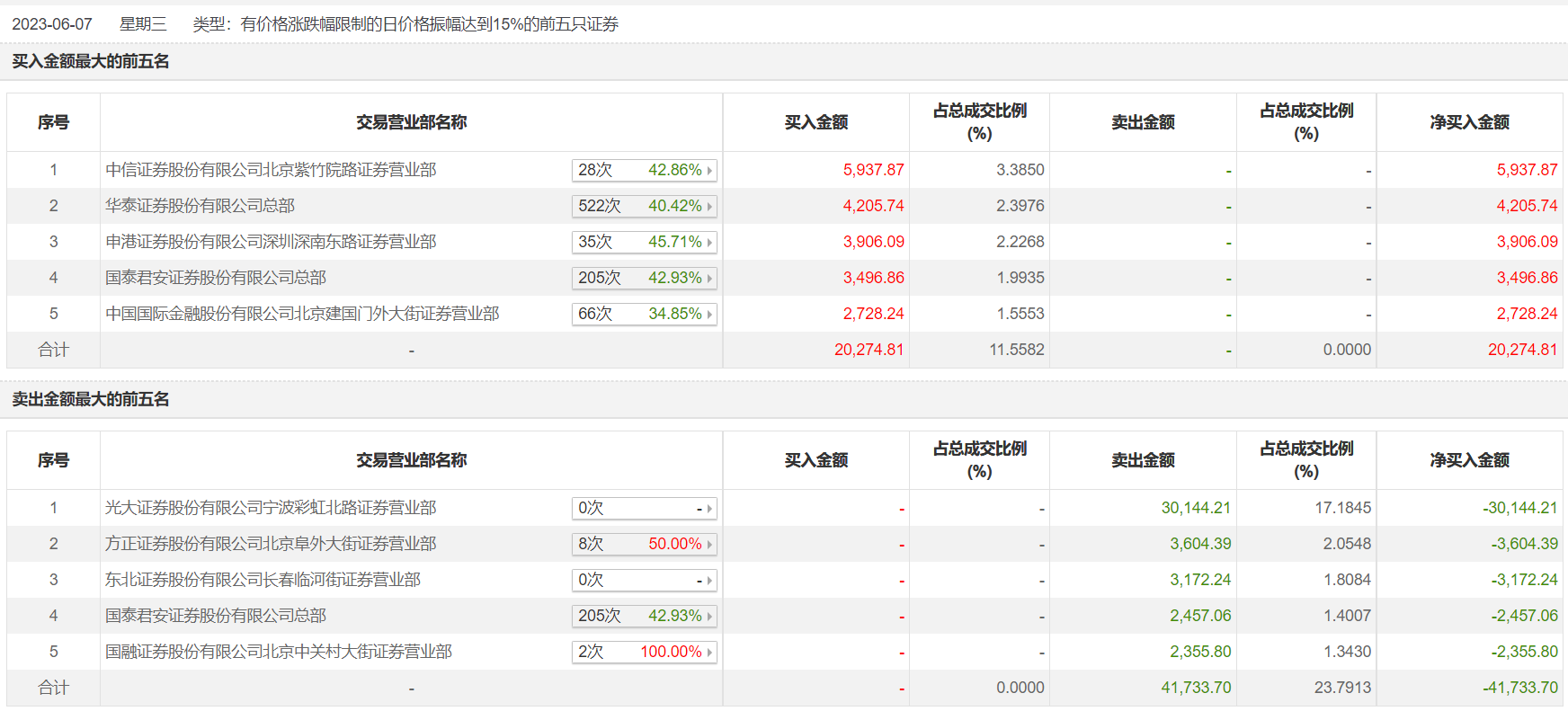 具体来看,中信证券北京紫竹院路证券营业部、华泰证券总部分别买入5937.87万元、4205.74万元;光大证券宁波彩虹北路证券营业部、方正证券北京阜外大街证券营业部分别卖出3.01亿元、3604.39万元。