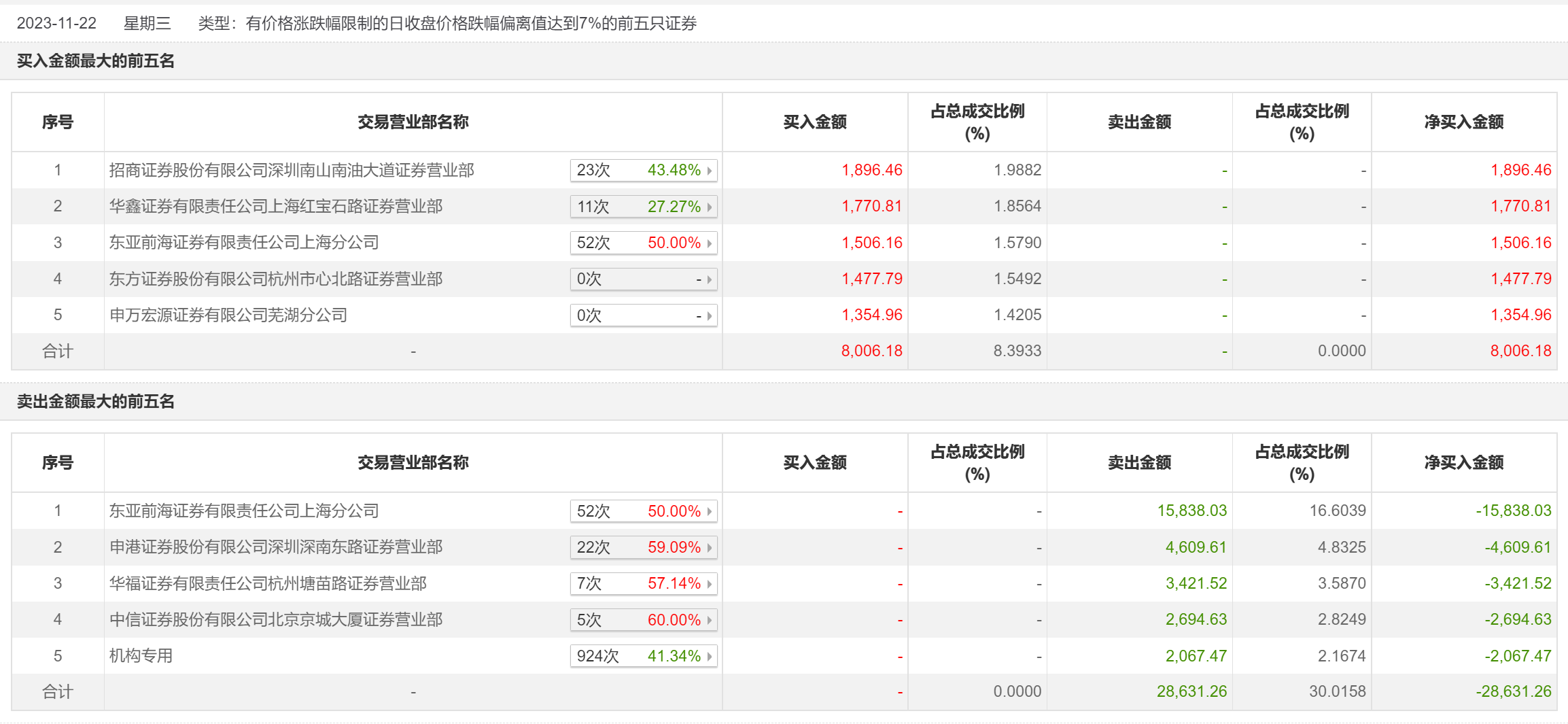 11月22日,利通电子今日跌停,龙虎榜数据显示,上榜营业部席位全天成交3.66亿元,占当日总成交金额比例为38.41%。其中,买入金额为8006.18万元,卖出金额为2.86亿元,合计净卖出2.06亿元。