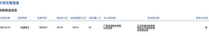 2月11日,利通电子大宗交易成交10万股,成交额467.4万元,占当日总成交额的0.22%,成交价46.74元,较市场收盘价57.12元折价18.17%。