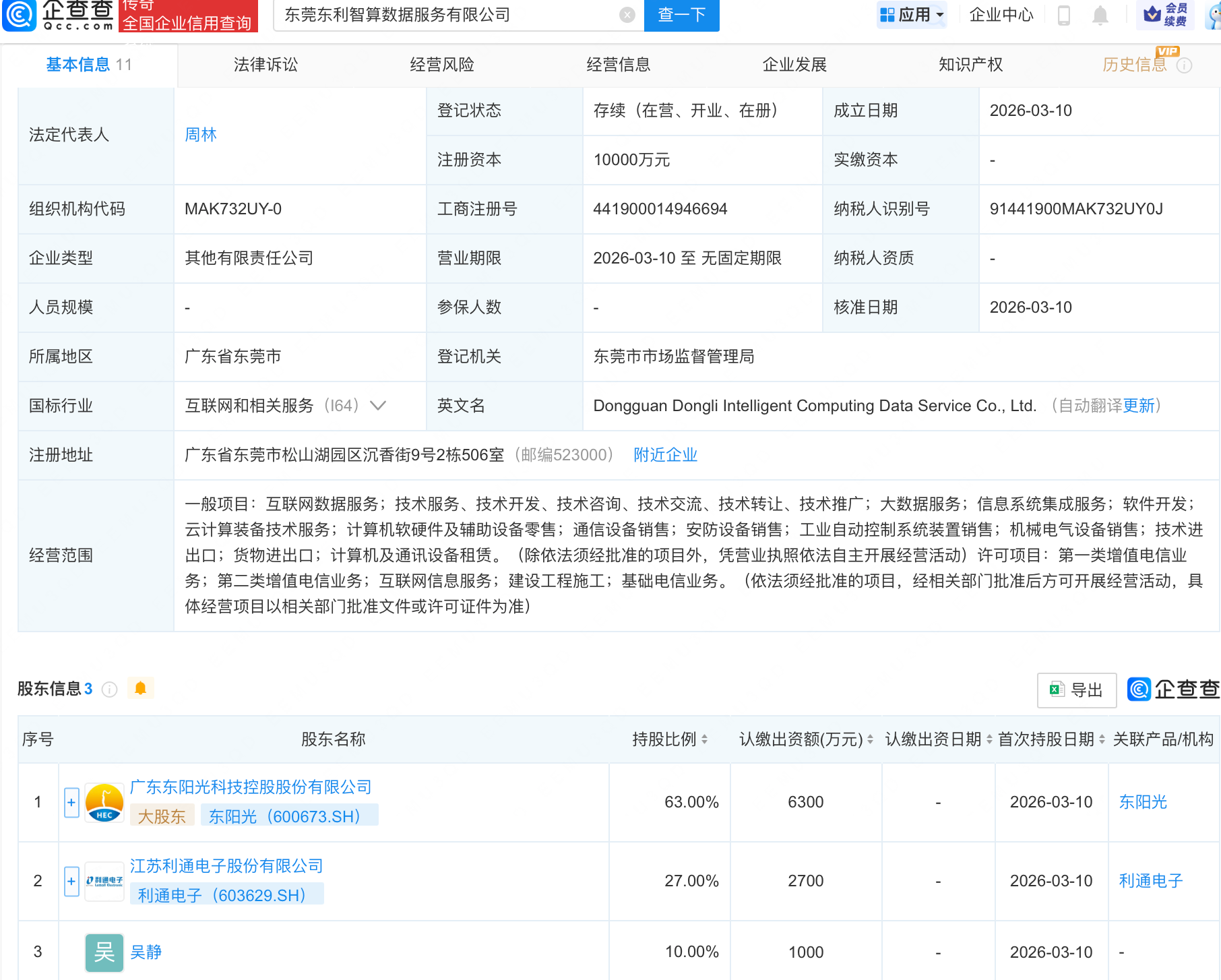 企查查APP显示,近日,东莞东利智算数据服务有限公司成立,注册资本1亿元,经营范围包含:第一类增值电信业务;第二类增值电信业务;互联网信息服务;建设工程施工等。企查查股权穿透显示,该公司由东阳光(600673.SH)、利通电子(603629.SH)等共同持股。