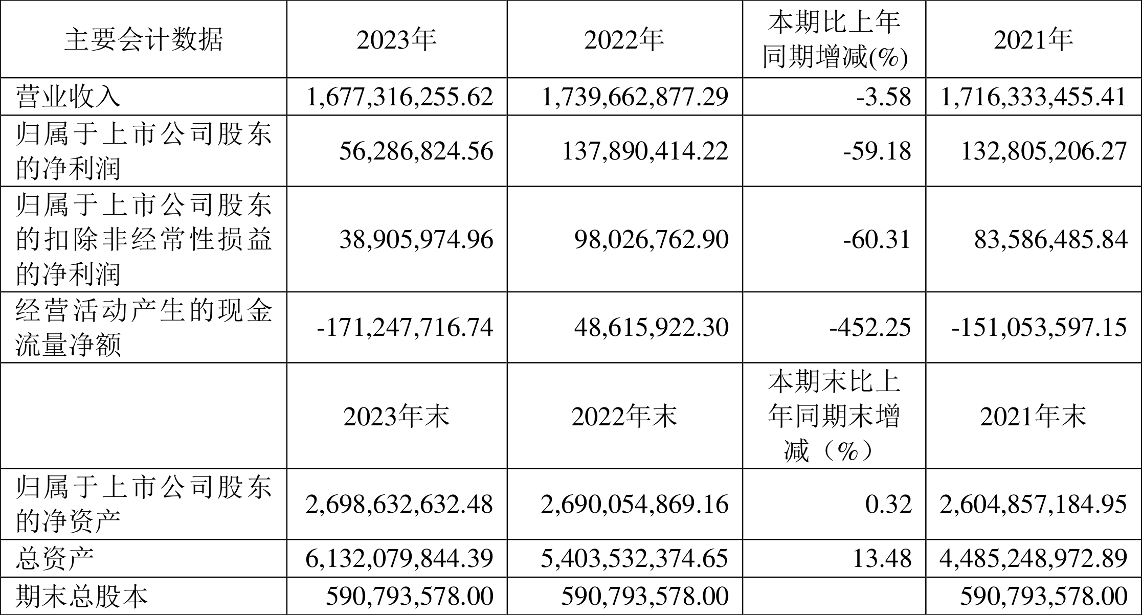 2023年,公司经营活动现金流净额为-1.71亿元,同比减少2.20亿元,主要系报告期内购买商品、接受劳务支付的现金增加所致;筹资活动现金流净额4.53亿元,同比增加2.75亿元,主要系报告期内取得借款收到的现金增加所致;投资活动现金流净额-4.75亿元,上年同期为4411.9万元,主要系报告期内购建固定资产无形资产和其他长期资产支付的现金增加所致。