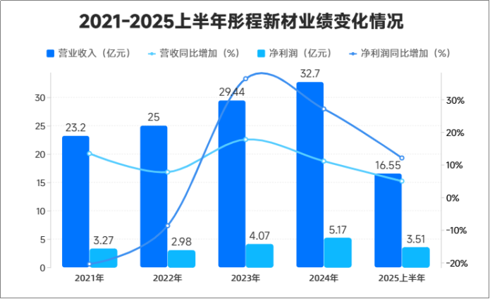 橡胶助剂、电子材料产品收入增长,带动公司业绩稳健上行。2021-2024年彤程新材营收从23.2亿增至32.7亿。2025上半年,实现净利润3.51亿,同比增长12.07%。