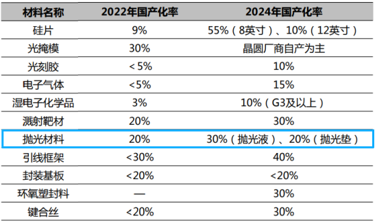 下图不难看出,近两三年硅片、光掩模、引线框架和环氧塑封料等多种半导体材料,完成了国产替代的华丽转身。2024年抛光垫国产化率约20%,给足了彤程新材这部分业务的营收增长空间。