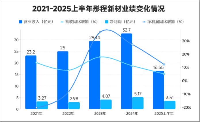 在稳健的基本盘与高增长的引擎共同驱动下,公司整体业绩持续上行。数据显示,2021年至2024年,彤程新材营收从23.2亿元增长至32.7亿元。2025年上半年,公司实现净利润3.51亿元,同比增长12.07%,展现出良好的盈利能力和成长性。