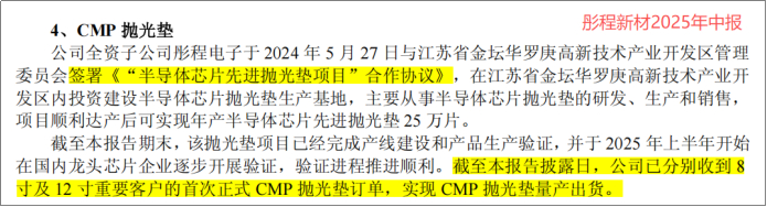 2025年4月,其子公司彤程电子签署了“半导体芯片先进抛光垫项目”合作协议。根据2025年中报,该项目已完成产线建设,并成功收到重要客户的8英寸和12英寸抛光垫订单,实现量产出货。