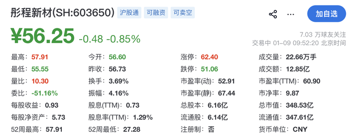 截至发稿时,彤程新材A股报56.25元,跌0.85%,总市值约348.53亿元。