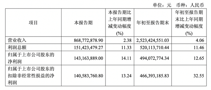 2025年前三季度,公司实现营收为25.23亿元,同比增长4.06%,归母净利润为4.94亿元,同比增长12.65%。